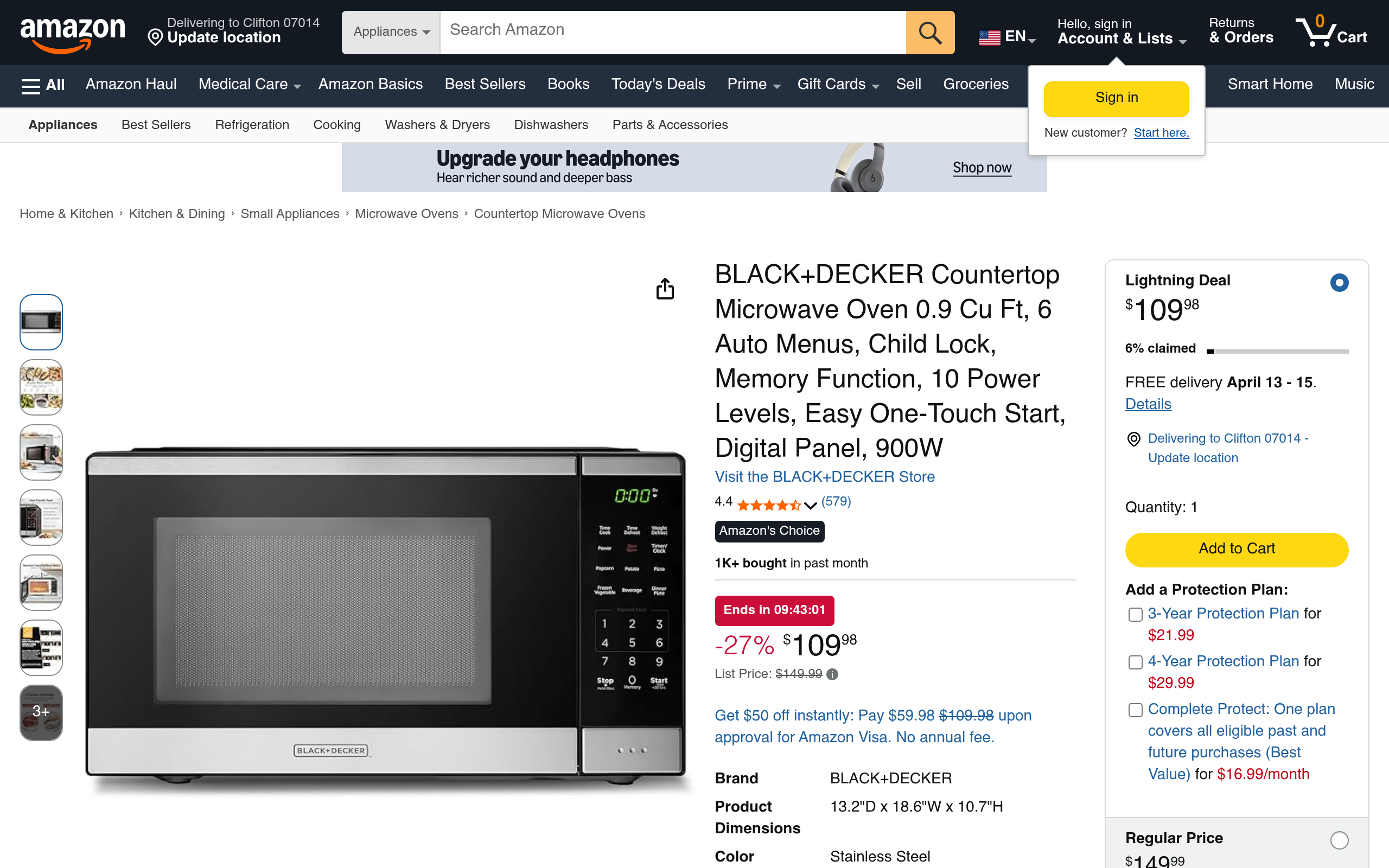Amazon Coupons Deals USA Black+Decker 900W 0.9-Cu. Ft. Countertop Microwave Oven: $109.99 April 9, 2026