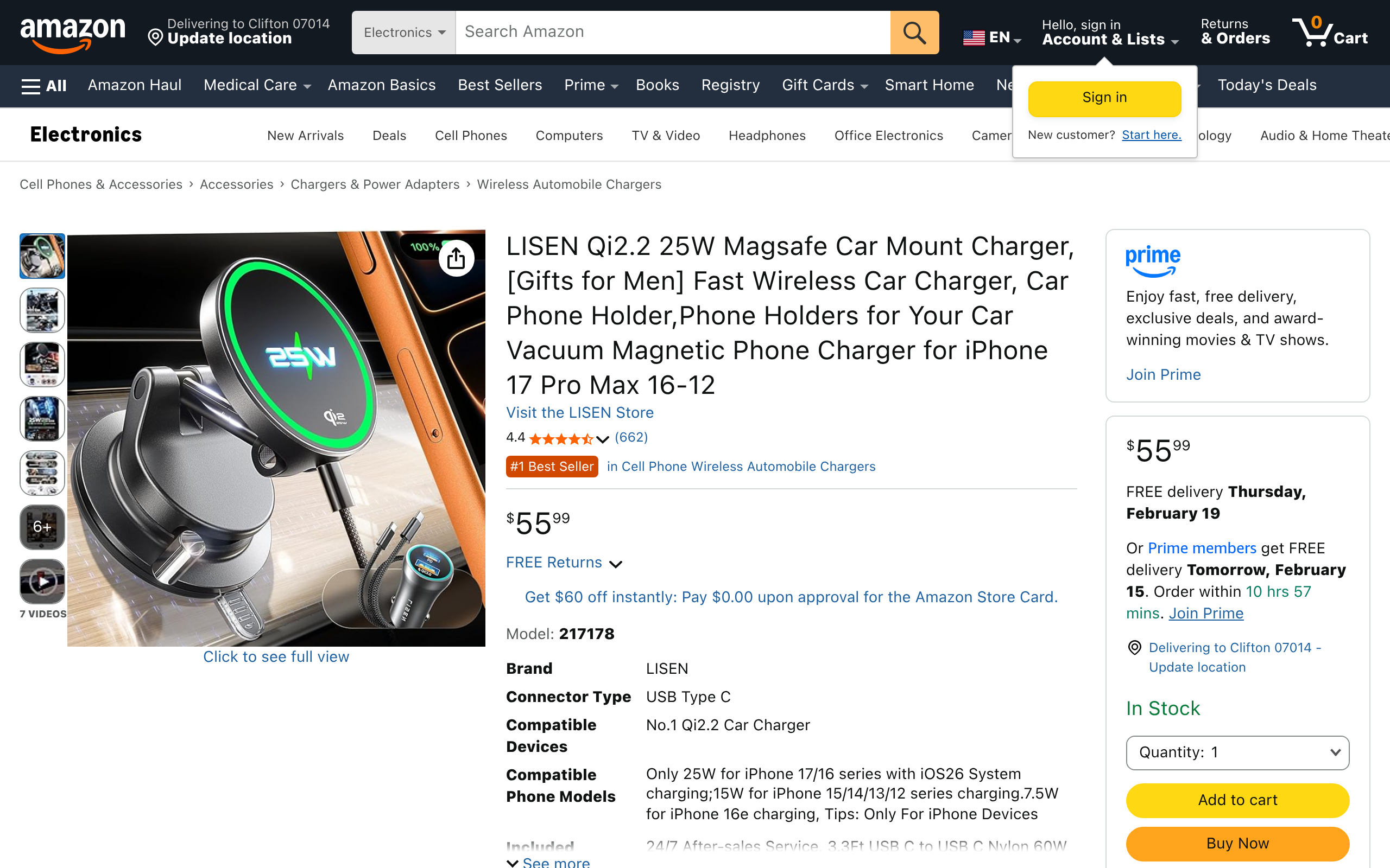 Amazon Coupons Deals USA Lisen Qi2.2 25W Magsafe Fast Wireless Car Mount Charger $18.99 February 14, 2026