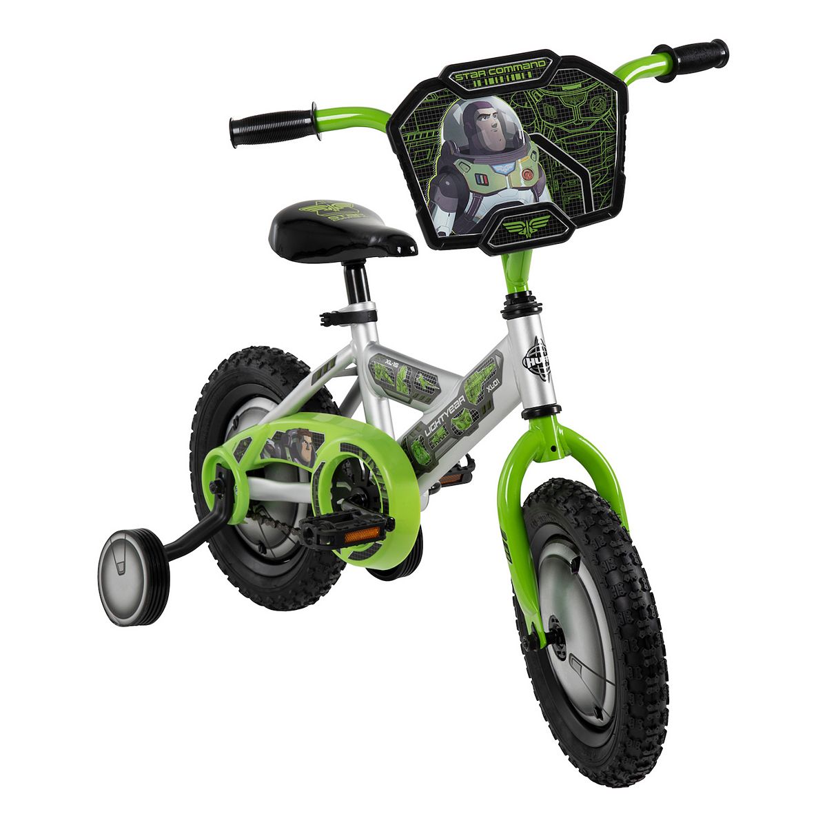 The silver steel frame covered in green Disney Lightyear graphics is sturdy and ready for every ride
