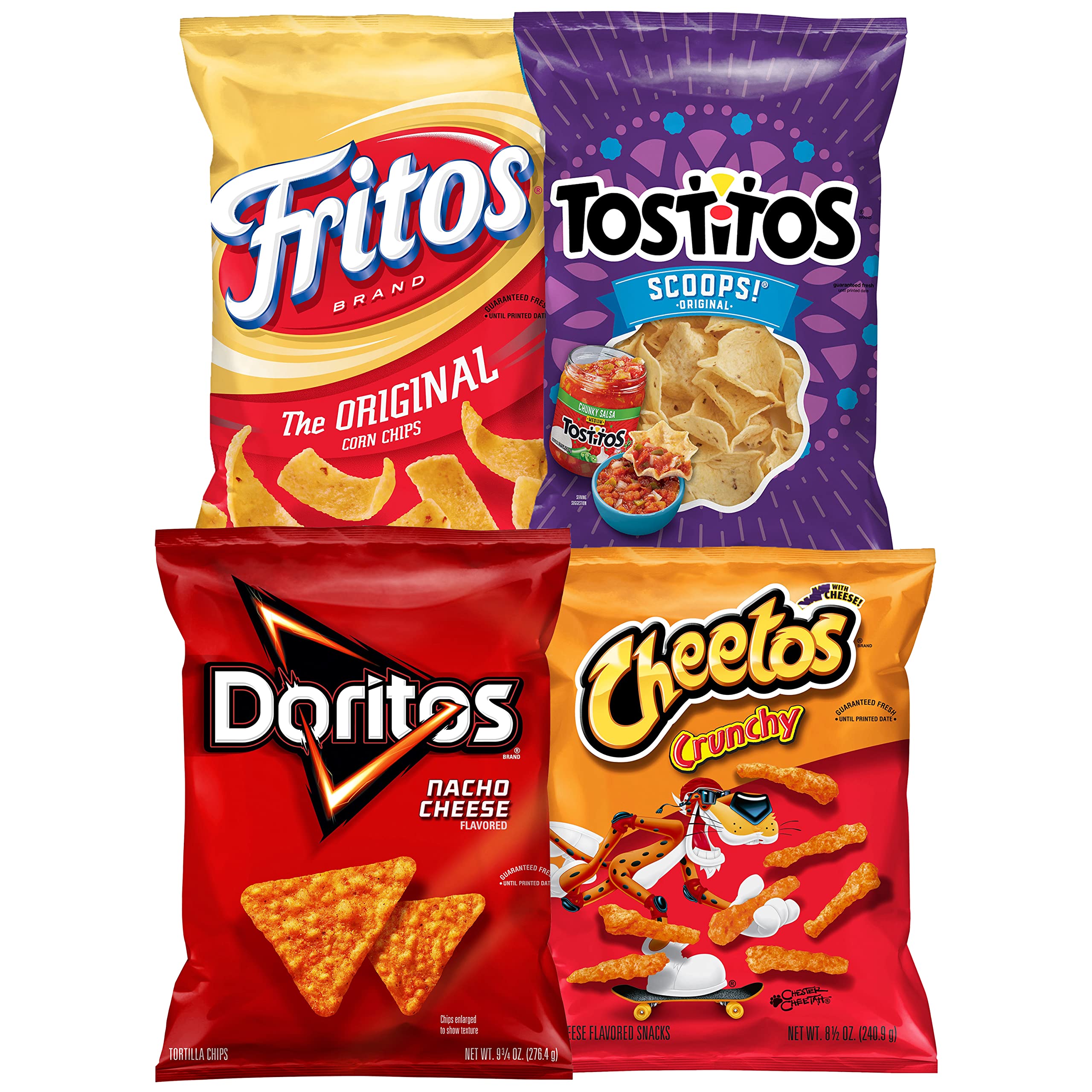 4 big bags of Frito Lay Snacks: 1 (9.75oz) Doritos Nacho Cheese, 1 (8.5oz) Cheetos Crunchy, 1 (10oz) Tostitos Scoops, 1 (9.25oz) Fritos Original
