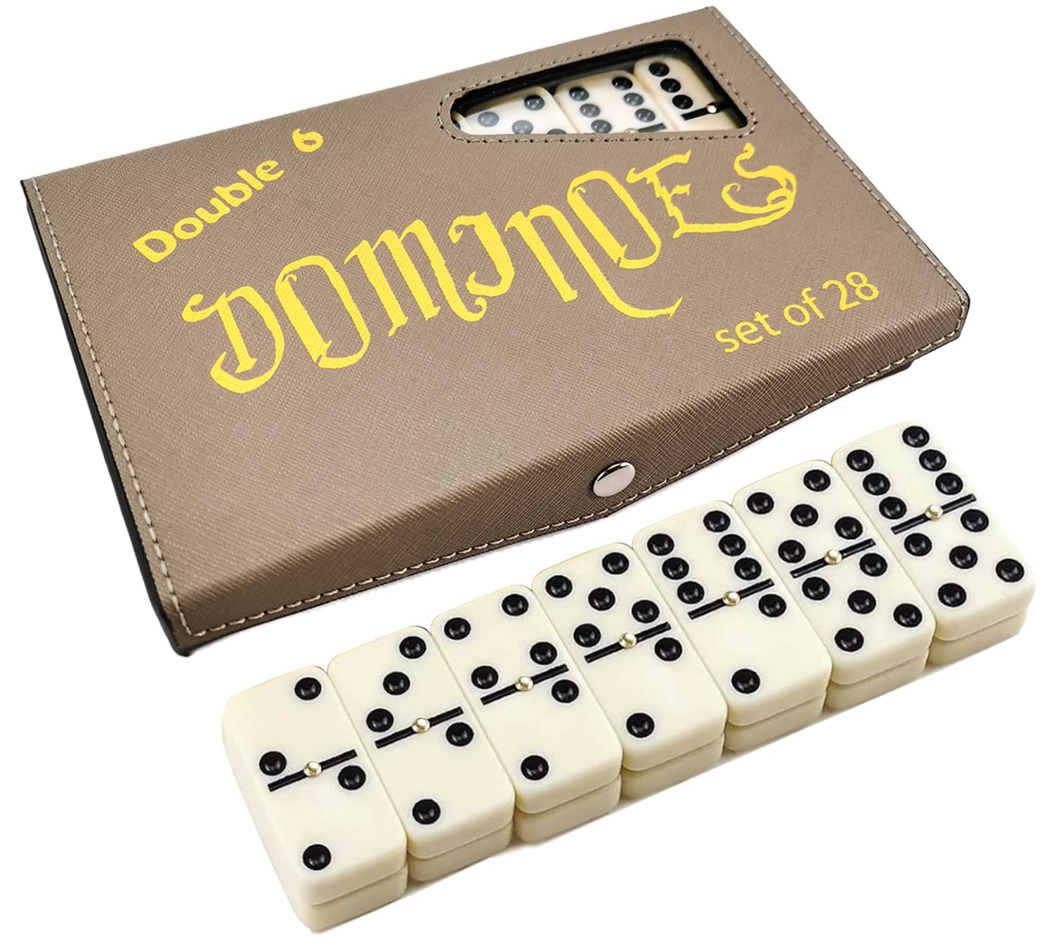 【Set Includes】 Dominoes double 6 includes 28 dominoes tiles classic black dotted ivory color dominos set with metal spinner. This dominoes set comes in a professional looking gray PU leather case. Simple to use and ready to be entertained, provide players with hours of fun.