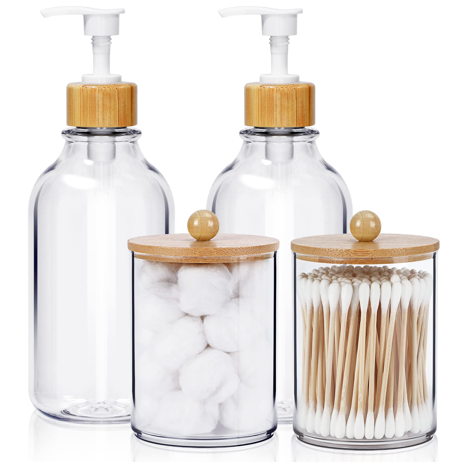 ⭐BATHROOM ACCESSORY SET: Makes the bathroom in order and adds a rustic farmhouse style to it. The set contains 2 Qtip apothecary jars with bamboo lids, 2 pack 16oz soap dispensers, and 8 water-proof stickers.