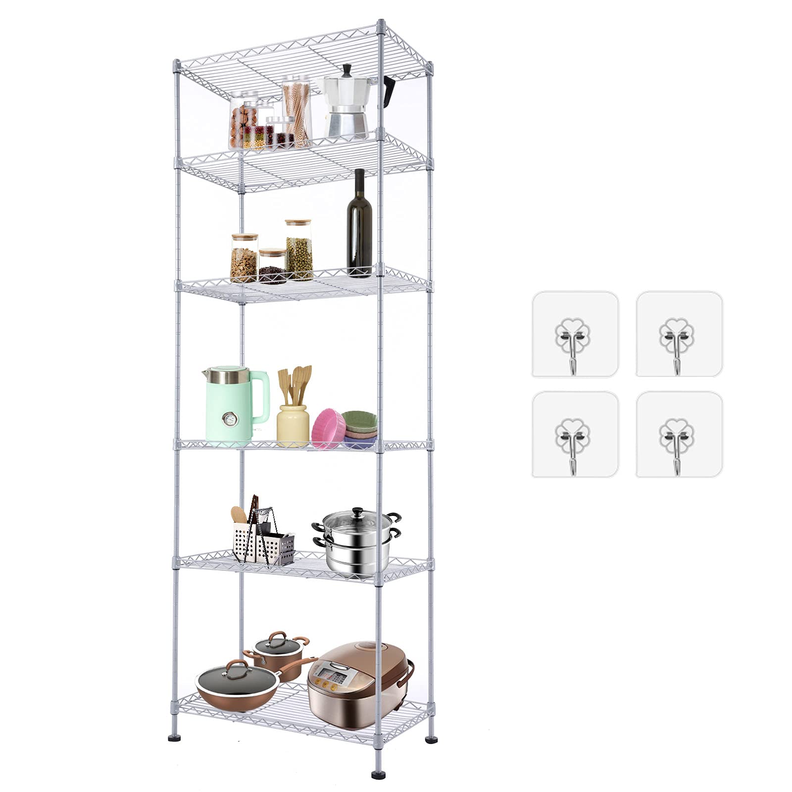【Large Capacity Strong Storage】Home kitchen shelves, The 6-tier design (with a big size of 21.26 x 11.42 x 62.99 inch) with 4 side hooks and 4 adhesive hooks wall hangers. You can place more items without taking up more space, meet your different needs and easily help you create a neat and organized home. Adhesive hooks will be perfect designer wall hooks for your home.