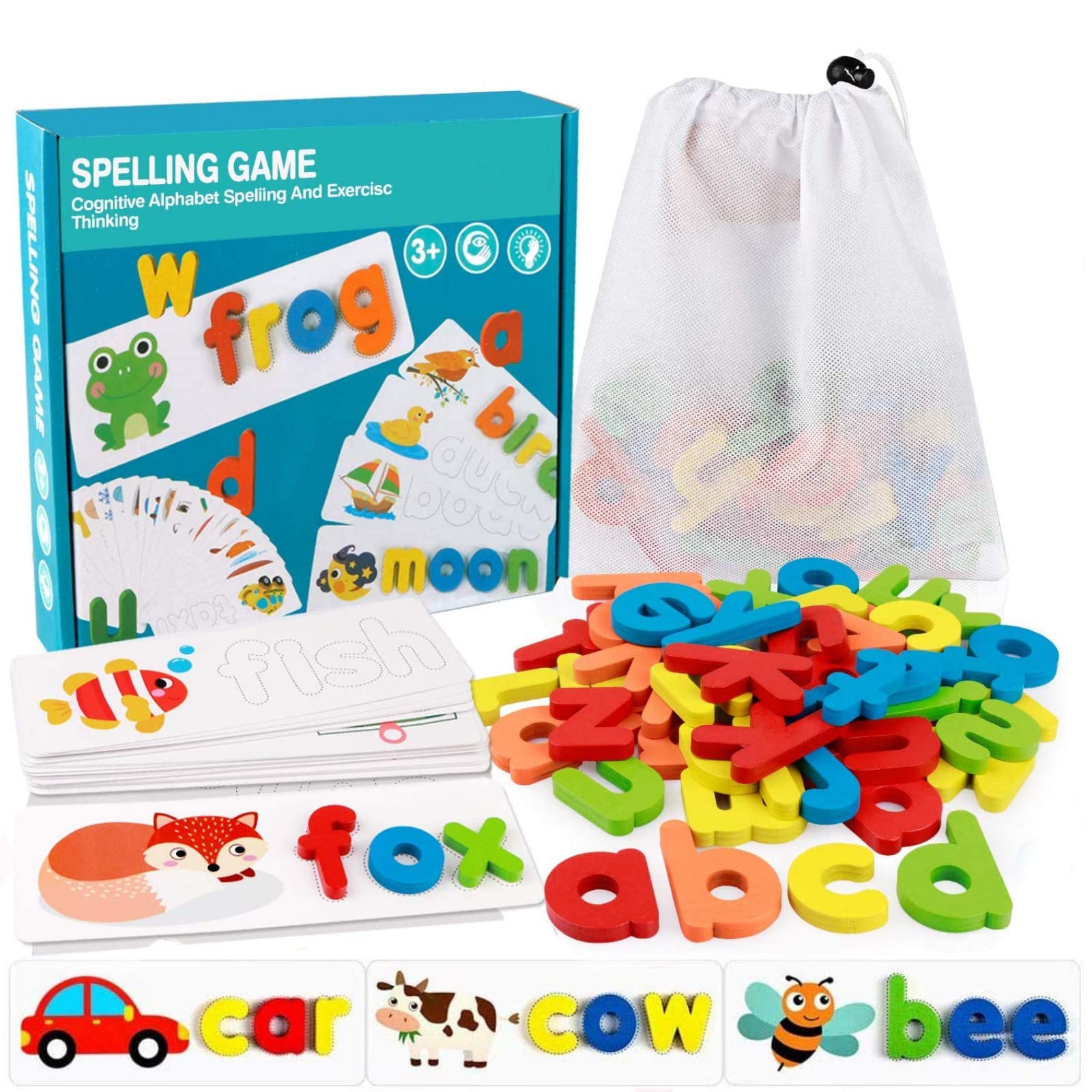 👪【Toddler Alphabet Matching Game】Preschool games for ages 3-7 has 28 double-sided word cards and 52 colorful lowercase letters.and 1 storage bag.