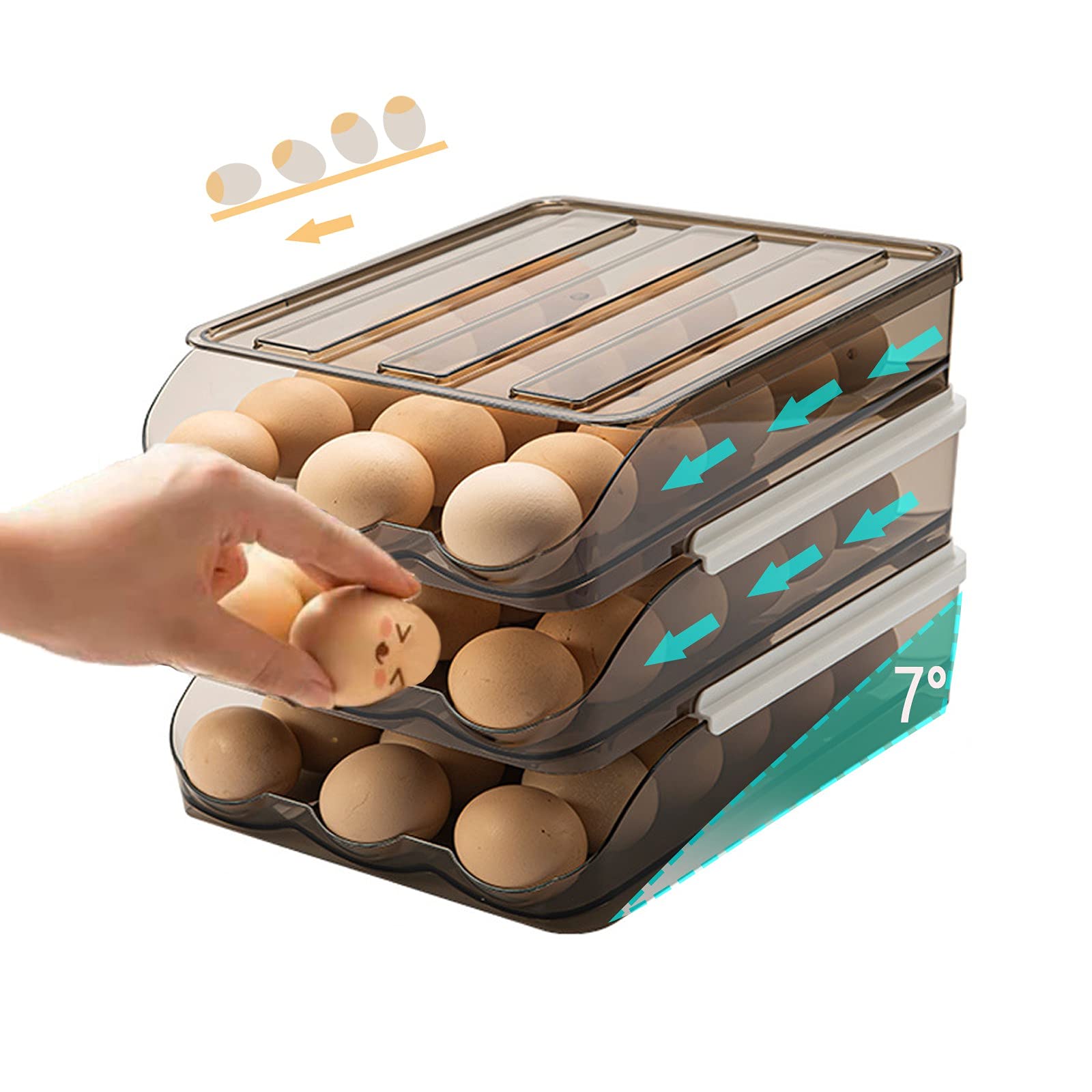 【Slide Design, Easy to Take Eggs】 The rolling egg box adopts a 7° slope design, and the eggs automatically roll-off to fill the place. Say goodbye to pulling and opening the lid, and taking eggs are easy.
