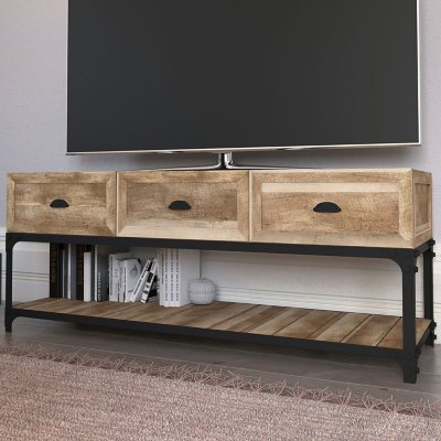 Add unique style to your home with the Elk Grove Rustic Pine TV Stand. This TV stand has three spacious drawers that are perfect to store remotes, gaming equipment, and movies, while the lower shelf provides plenty of room for a game console and cable box. The stand is constructed of durable engineered wood and textured laminate that looks and feels like real wood. Assembly is easy and can be done in thirty minutes or less.