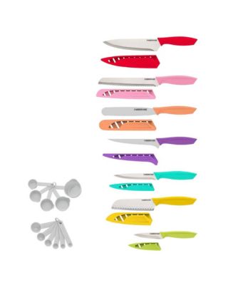 Outfit your kitchen in color! Farberware’s vibrant 25-piece cutlery and kitchen tool set includes the essentials you need to chop, slice, dice, measure and more. Knives feature sturdy stainless steel blades plus sheaths for safe and secure storage.