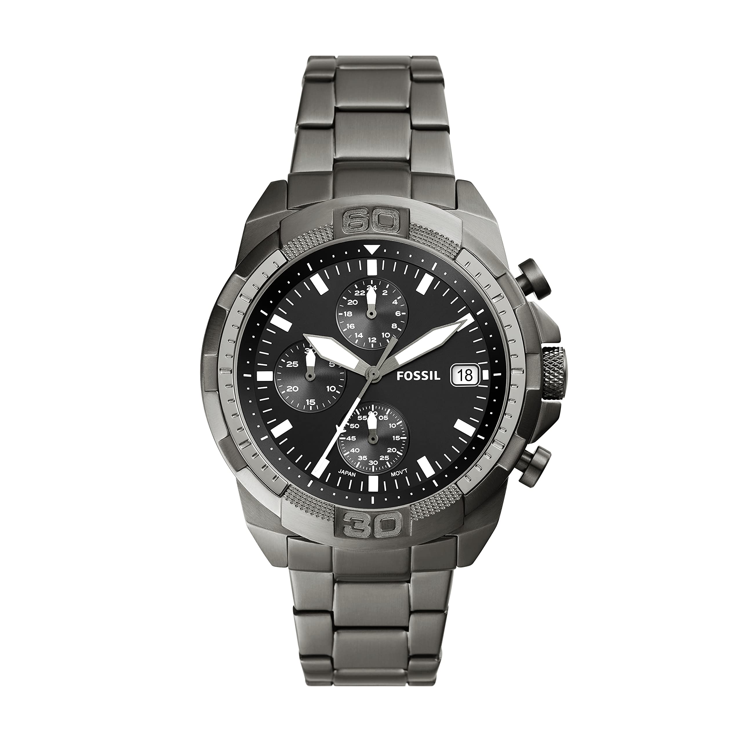 Smoke stainless steel case with black satin dial; smoke stainless steel bracelet band; interchangeable with all 22mm Fossil watch bands