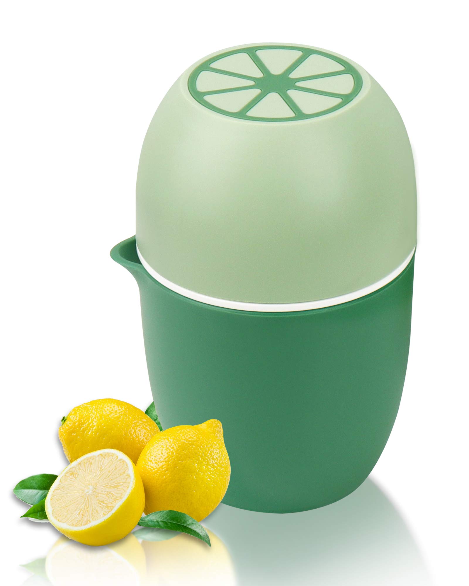 Excellent Performance: Two ways of using this lemon juicer are suitable for not only citrus fruits but also grape, pomegranate, etc.. The lid of the orange juicer can hold fruits firmly and keep your hands clean. Two cones are sharp enough for complete juicing but harmless to your hands, with many holes to prevent juice from blocking. The lemon squeezer container has a spout convenient to pour juice and a non-slip gasket.