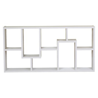 Display your books and collectibles in style with this Homes: Inside + Out Highpoint contoured bookcase. Add extra display space in a smaller bedroom or main room with casual appeal. Enjoy its floating illusion and open shelving for displaying decor and books. A sleek white laminate finish brightens any space, looking especially distinctive against a wallpapered or darker painted wall. Its eye-catching asymmetrical shapes mimic a puzzle to make it decidedly modern, and the white laminate finish gives it a clean, crisp feel.