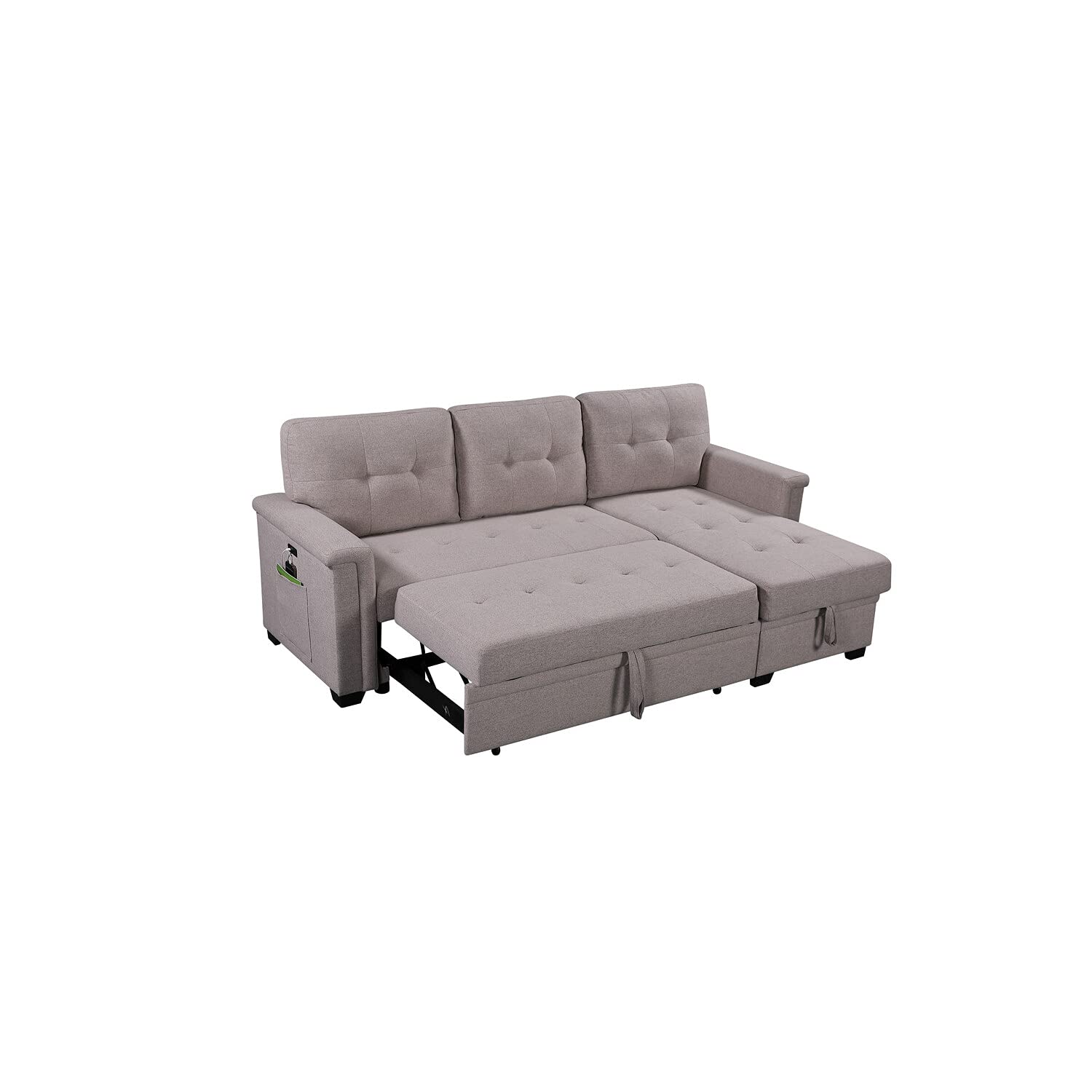The sofa is the perfect choice for you! This three piece reversible sectional couch is easy to assemble. With a pull out bed, USB charging ports, spacious storage chaise, and side pocket and pouch for all your essential needs. The piece is the ultimate functional sofa you ever need, use it as a bed, a storage, and a place where you can charge your phone while chilling, and enjoying your favorite TV show and movie.