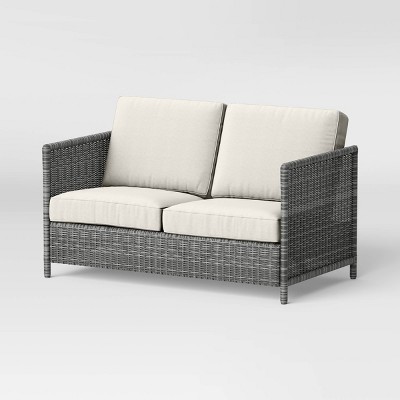 Create your own outdoor paradise with this Monroe Motion Wicker Patio Loveseat from Threshold™. Made with a metal frame and wrapped in an all-weather wicker, this patio loveseat lends an inviting feel to your outdoor seating space. This wicker outdoor loveseat features a high-back design and it comes with two padded deep seat and two back cushions for comfortable seating for up to two people. Coordinate it with a wicker sofa, chairs and end table to transform the look and feel of your outdoor seating nook.