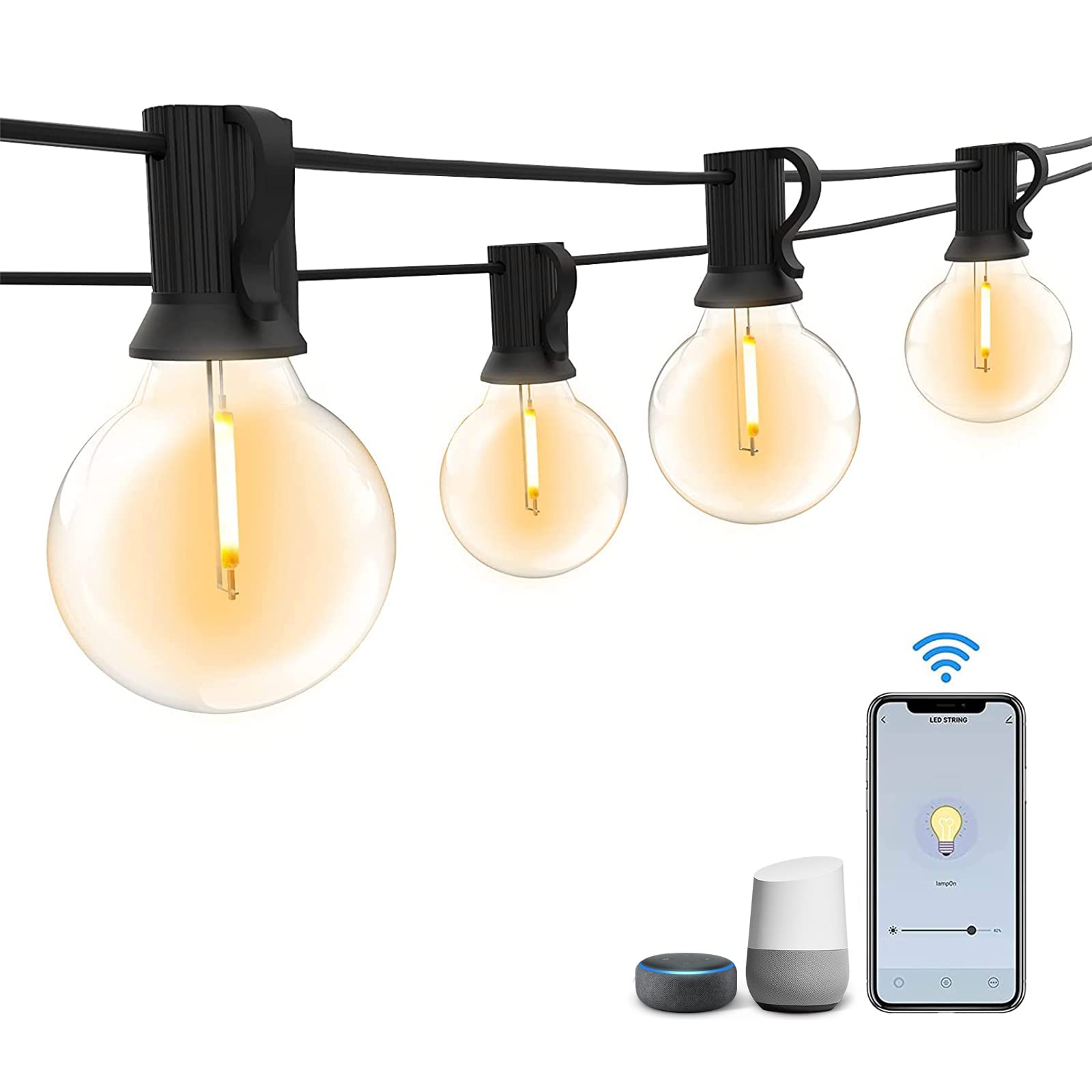 【Dimmable & Energy Saving】Yuusei smart led bulb string lights are dimmable via App and voice, stepless dimming from 1% to 100%. The power of each G40 LED globe bulbs are 0.5W low wattage, saving up to 90% energy but more bright and life long. 2700K Warm white outdoor decorative light string perfect for patio, backyard, garden, deck, coffee, bistro, pergola, market, balcony.