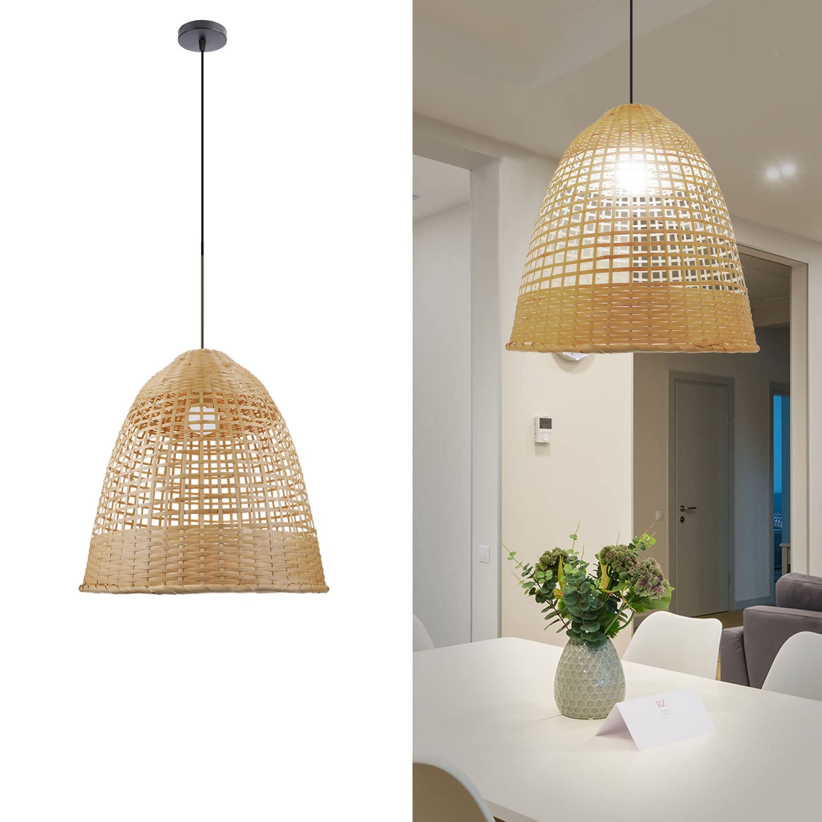🎋【Classic Ceiling Light】Size measures W 15.7" x H 16.5", metal ceiling canopy measures ⌀3.7"(Dia). Hardwired connection,durable and adjustable white cable(1.2m long/47.2in) included, it support adjustable from 0" to 47.2", allows you to adjust to suit your different lighting needs. Perfect for different types of bedroom, living room, balcony, dining room, ceremony hall, dining room and cafe. Definitely a high quality bamboo-woven chandelier that will attract admiration.