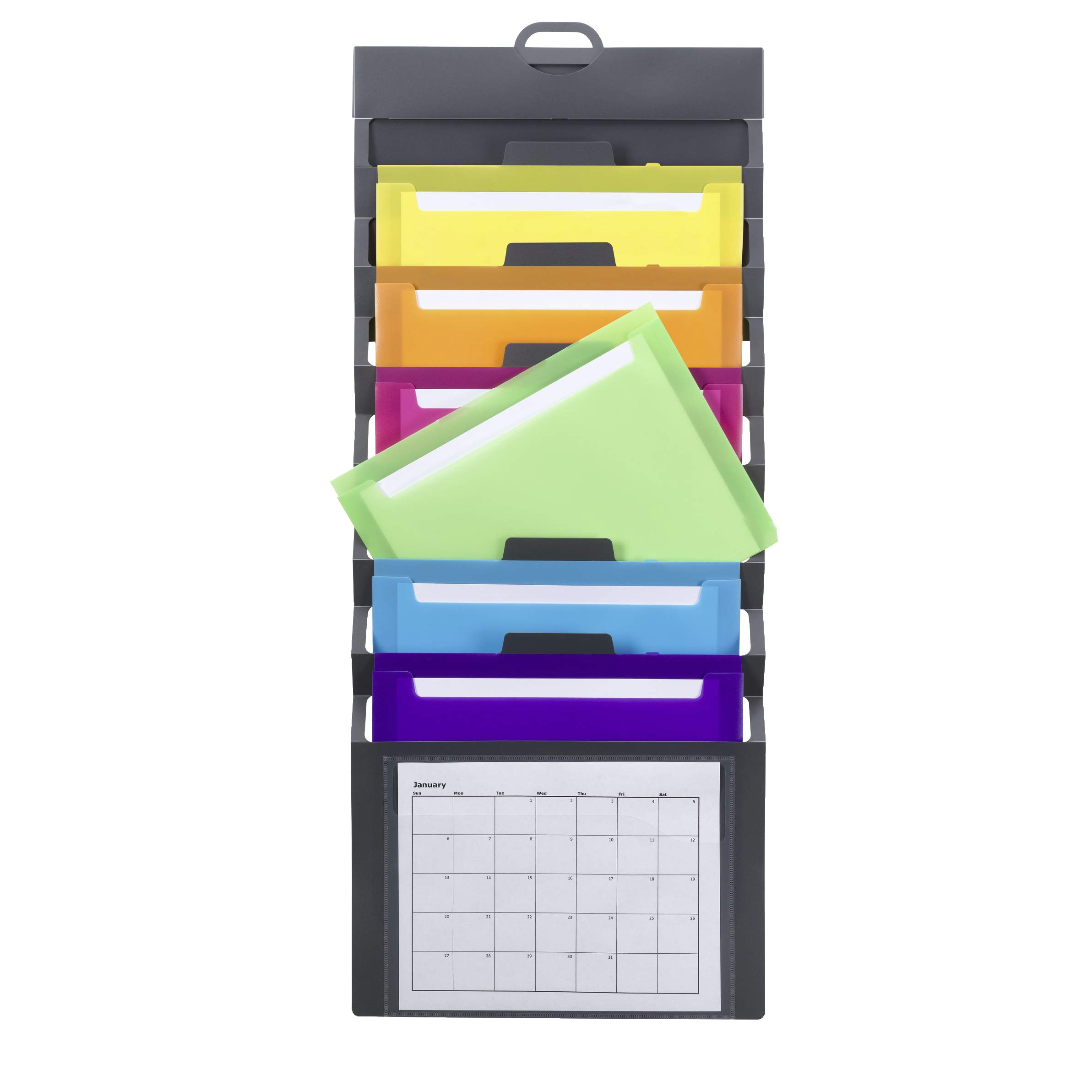 Includes 1 letter size hanging wall organizer (14-1/4" W x 36-1/4" H when open) with 6 removable file folder pockets in bright colors, 1 clear front pocket and 1 blank label sheet
