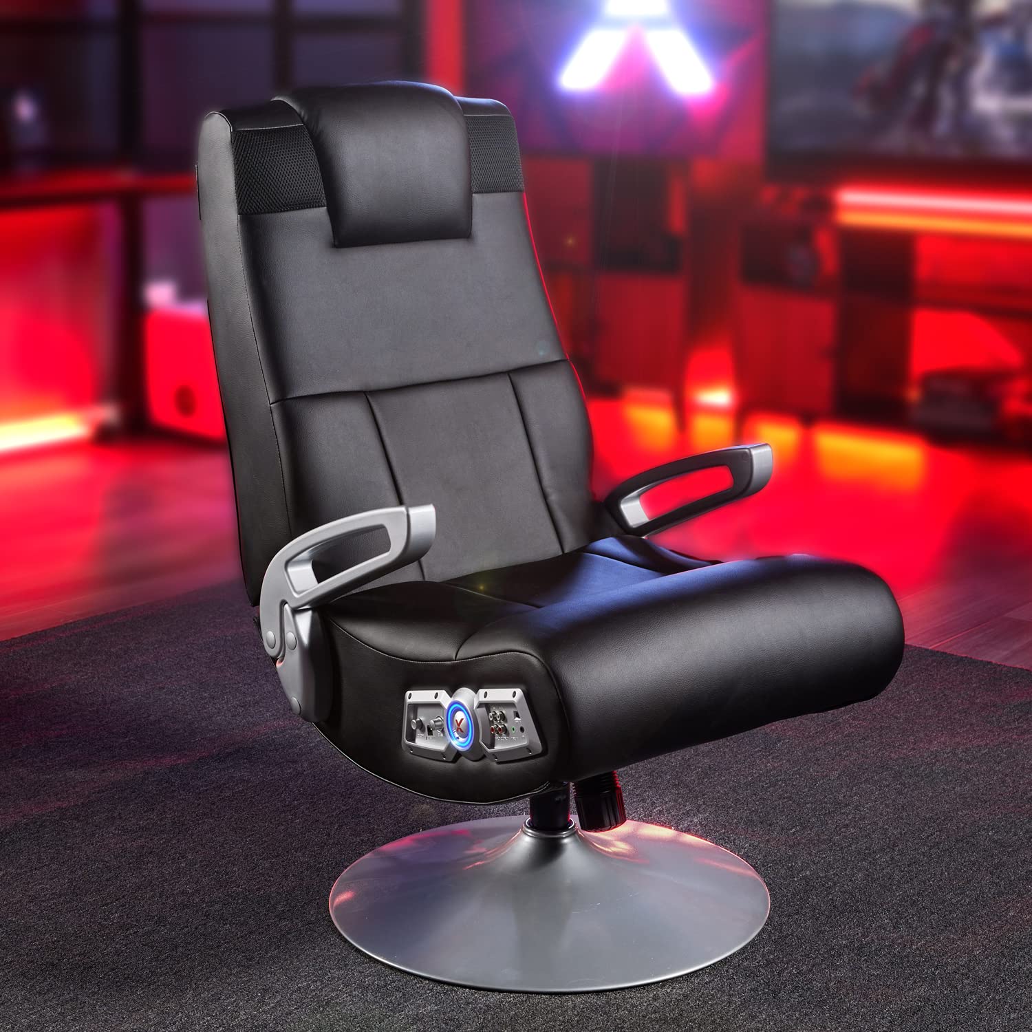 Welcome to the world of interactive audio! With the X Rocker SE 2.1 Wireless Pedestal Gaming Chair, regular and professional gamers alike can now not only hear sounds of the game, but actually feel it. Whether you are listening to music, watching a movie, or playing a game, you will become a part of the excitement. The X Rocker has wireless audio transmission and 2.1 sound system with two built-in speakers and subwoofer. The side control panel has volume, bass control, input/output jacks, band switch, and a headphone jack for personal use. Play for hours in comfort with the ergonomic design, padded headrest, armrest, chair tilts, and swivels. The foldable construction allows for ease of storage and portability. This gaming chair has a easy to clean, heavy duty upholstery vinyl cover for your convenience. Connects to most video game, audio or video devices.